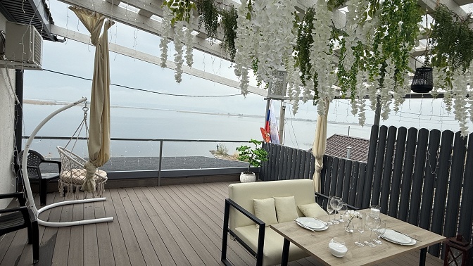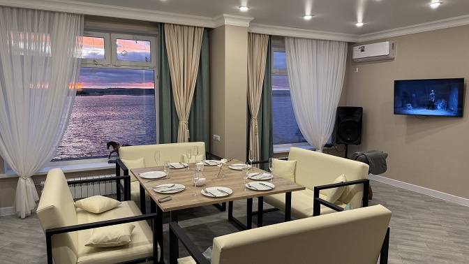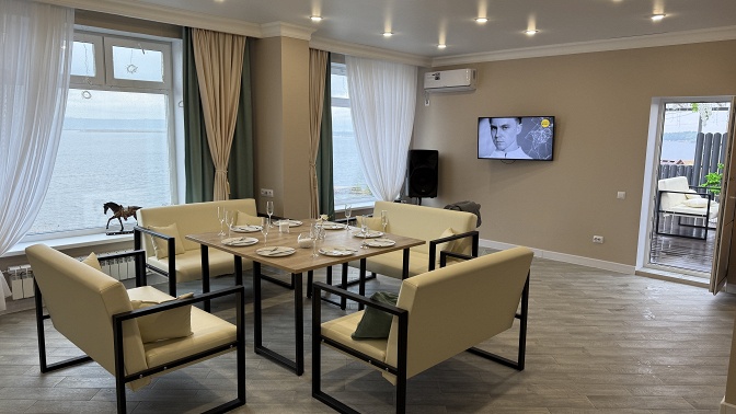 — зона отдыха (терраса с видом на Волгу, на которой есть микроволновая печь, холодильник, посуда, чайник, массажное кресло, банные принадлежности, массажный стол, колонка и караоке);